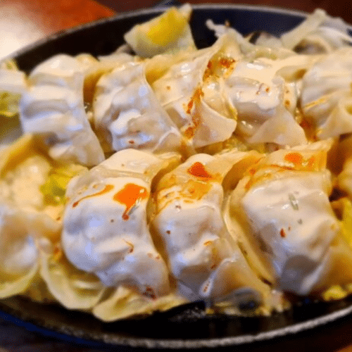 Hausgemachte gedämpfte Teigtaschen mit Rindfleisch-Füllung dazu hausgemachte Soße serviert mit salat